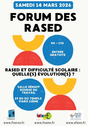 AFPEN-FNAME-FNAREN – 14ème Forum des RASED, 14 mars 2025 « RASED et difficulté scolaire : quelle(s) évolution(s) ? » Samedi 14 mars de 9h à 17h -Salle Hénaff, bourse du Travail, 29 Bd du Temple Paris, 11ème Intervention de Jacques BERNARDIN (président GFEN) : « Penser la difficulté scolaire » Lire l’argumentaire 12 décembre 2025 Valérie Pinton