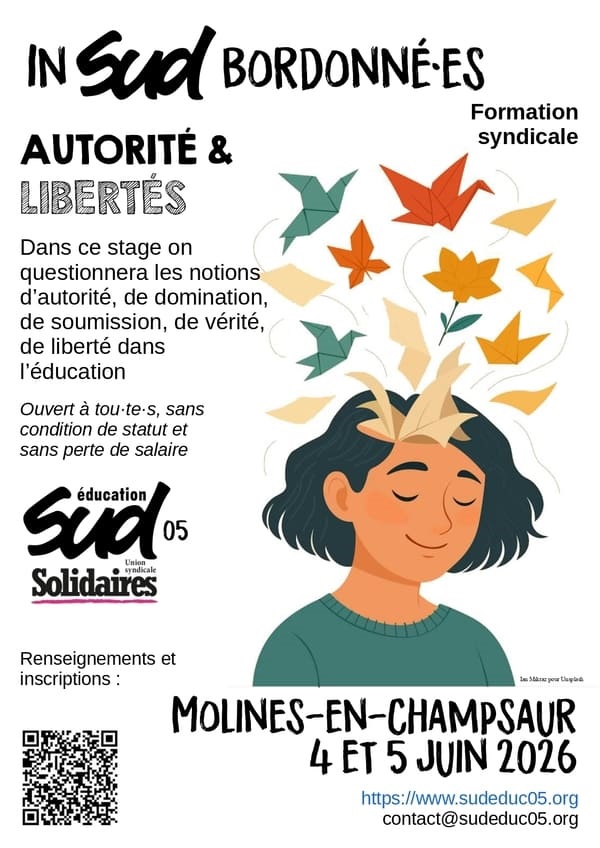 Formation SUD éducation 05 « InSUDbordonné·es autorité et libertés » – 4 et 5 juin 2026 Dans ce stage on questionnera les notions d’autorité, de domination, de soumission, de vérité, de liberté dans l’éducation, avec des intervenant·es du Groupe français d’Éducation Nouvelle (GFEN), du groupe Freinet, et peut-être des invité·es surprise. La formation syndicale est ouverte à tou·te·s, sans condition de statut et sans perte de salaire, à hauteur de 12 jours par an. Ce stage se déroule sur deux jours avec hébergement dans un gite situé à Molines-en-Champsaur. Il est possible d’arriver la veille au soir. Programme et inscription 21 avril 2026 Valérie Pinton