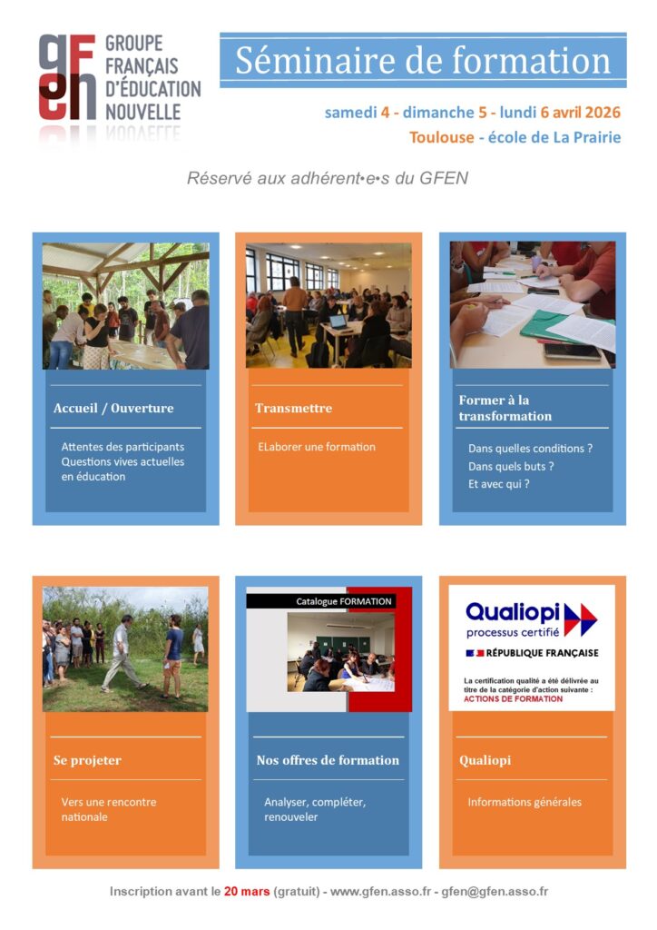 Séminaire de formation du GFEN, 4-5-6 avril 2026 Transmettre / Former à la transformation / Se projeter Réservé aux adhérent.e.s. (adhésion ici) Programme et modalités pratiques Formulaire d’inscription au séminaire de formation Veuillez activer JavaScript dans votre navigateur pour remplir ce formulaire.Veuillez activer JavaScript dans votre navigateur pour remplir ce formulaire.Nom *PrénomNomE-mail *Adhérent·e au GFEN *Adhérent·ePas Adhérent·eLe séminaire est réservé aux adhérent.e.s du GFEN. Vous pouvez adhérer ici : https://gfen.asso.fr/adherer/ Je souhaiteune attestationPrésenceSamedi 4 avrilDimanche 5 avrilLundi 6 avrilDéjeuner du dimancheOuiNonEnvoyer 2 février 2026 Valérie Pinton