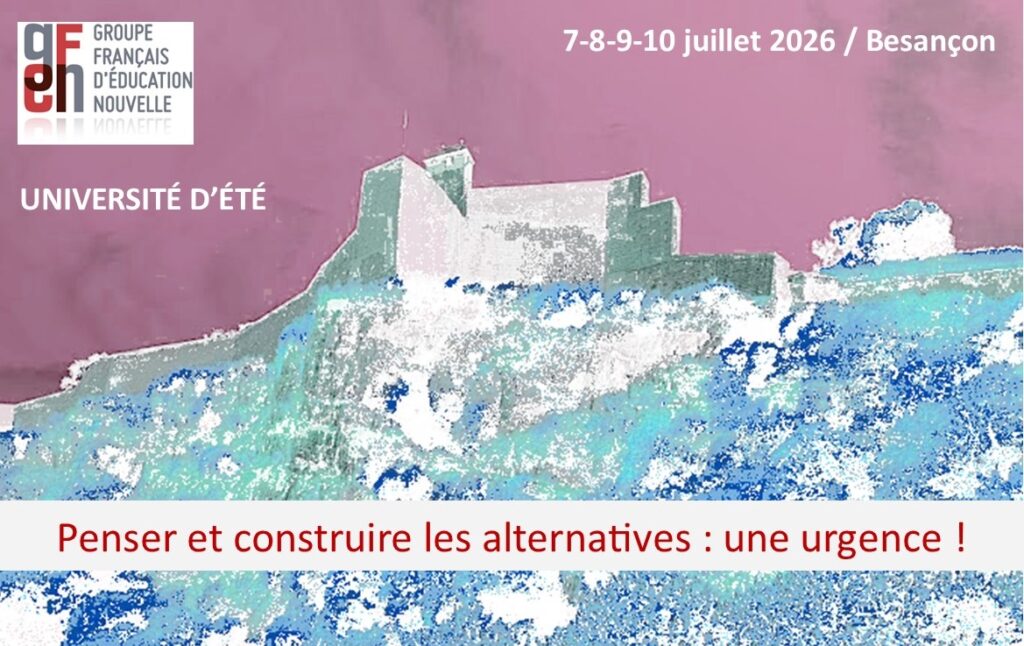 Université d’été : 7-8-9-10 juillet 2026 à Besançon Penser et construire les alternatives : une urgence ! Sommes-nous dans un « film catastrophe » ? Les guerres, l’explosion des inégalités sociales et des discriminations, l’emprise des technologies, de l’IA, la désinformation, le développement de la haine de la démocratie, le repli sur soi et la peur de l’autre, le dérèglement climatique et l’effondrement de la biodiversité : Tout cela est-il inéluctable ? « There is no alternative ! » Ce slogan néo-libéral connaît une postérité éblouissante – pour ne pas dire aveuglante. Aujourd’hui, c’est la formule magique utilisée par ceux qui se pensent les plus puissants pour verrouiller tout débat afin d’imposer leurs visions du monde au mépris des réalités tant politiques, sociales qu’écologiques qui deviennent pourtant explosives. Sommes-nous condamnés à la guerre des récits ? Devrions-nous nous résigner aux renversements de valeurs que cette affirmation autorise en s’appuyant sur toutes les formes de violence possibles ? Osons le contrepied. Les alternatives sont possibles ! Les chercher, participer à leur construction, faire en sorte qu’elles s’incarnent concrètement dans un nouveau monde et une nouvelle humanité à inventer : de longue date le Groupe Français d’Education Nouvelle fait le pari qu’un autre monde est possible. « Tous capables ! » « Tous chercheurs, tous créateurs ! » À l’heure où les périls s’accumulent, il nous semble indispensable de faire à nouveau ce pari, de se remettre au travail collectivement pour participer aux ruptures plus que jamais urgentes. Et ces ruptures ne pourront se faire qu’en se donnant des outils pour les rendre possible : construire une lecture plus juste du réel ; construire ou redécouvrir les moyens d’action à portée de nos mains nous permettant de faire autrement. Voilà l’enjeu de l’Université d’été du GFEN – rien de moins ! Cette Université d’Été se déroulera sur 4 jours, du 7 au 10 juillet 2026, et chacune des journées sera articulée autour d’une question vive. Elle sera précédée d’une pré-université le 6 juillet. Jour 1 : L’opinion, l’information, les savoirs, la vérité : comment y voir clair dans un monde chaotique ? Comment développer la rationalité critique ? Jour 2 : La technique : super pouvoir à conquérir ou nouvel asservissement ? Jour 3 : Cultures plurielles : au-delà des différences, comment faire du commun ? Jour 4 : Emancipation, libération, désaliénation : comment s’autoriser ? Quels engagements, quelles solidarités, quelles résistances-désobéissances construire ? Informations pratiques : Lieu : Lycée Polyvalent Jules Haag – 1 rue Labbé – 25000 Besançon Dates : Lundi 6 juillet : pré-UE (temps de finalisation de la préparation de l’UE)Université d’été : mardi 7, mercredi 8, jeudi 9 et vendredi 10 juillet 2026 Hébergement / Repas :Hébergement collectif, chambre de 3 ou 4 personnes Nuit + petit-déjeuner : 15 € Repas : 7 € Un accueil des enfants à partir de 2 ans est prévu. Frais pédagogiques pour les 4 jours d’université d’été : Adhérent.e.s au GFEN : 5 % du revenu mensuel Non adhérent.e.s au GFEN : 7 % du revenu mensuel Organismes de formation/salarié.e au titre de la formation professionnelle : 300 €. A la journée : 35 € (adhérent.e) / 45 € (non adhérent.e) Et si vous voulez en profiter pour visiter la belle ville de Besançon, suivez le guide ! Présentation et bulletin d’inscription à imprimer Formulaire d’inscription Veuillez activer JavaScript dans votre navigateur pour remplir ce formulaire.Veuillez activer JavaScript dans votre navigateur pour remplir ce formulaire.Prénom NOM *PrénomNomE-mail *AdresseTéléphoneProfessionAdhérent·e au GFEN *Adhérent·ePas Adhérent·eJe souhaiteune attestationune factureHormis les informations concernant l'UE, j'autorise le GFEN à m'envoyer des informations (activités, publications)OuiNonDonnées personnelles – information : Nous recueillons vos données pour gérer votre inscription à l'UE et vous informer. A tout moment, vous pouvez nous en demander l’accès, la modification et la suppression, selon les dispositions de la RGPD entrées en vigueur le 25 mai 2018.Jours de PrésenceLundi 6 juilletMardi 7 juilletMercredi 8 juilletJeudi 9 juilletVendredi 10 juilletHébergement (petit-déjeuner compris)Lundi 6 juillet - 15,00 €Mardi 7 juillet - 15,00 €Mercredi 8 juillet - 15,00 €Jeudi 9 juillet - 15,00 €Hébergement collectif à l'internat, chambre de 3 ou 4RepasMardi 7 juillet MIDI - 7,00 €Mardi 7 juillet SOIR - 7,00 €Mercredi 8 juillet MIDI - 7,00 €Mercredi 8 juillet SOIR - 7,00 €Jeudi 9 juillet MIDI - 7,00 €Jeudi 9 juillet (restaurant en ville paiement individuel) - 0,00 €Vendredi 10 juillet MIDI - 7,00 €Frais pédagogiquesAdhérent.e.s au GFEN : 5 % du revenu mensuelNon adhérent.e.s au GFEN : 7 % du revenu mensuelOrganismes de formation/salarié.e au titre de la formation professionnelle : 300 €A la journée Adhérent.e : 35 € (ne pas compter la pré-UE)A la journée Non adhérent.e : 45 € (ne pas compter la pré-UE)Vos frais pédagogiques Reporter ici le montant correspondant à votre situationPrix minimum : 20,00 €Remarques / Questions - Indiquer ici si vous souhaitez faire garder vos enfants et leurs âgesTotal (Nuits+Repas+Frais pédagogiques) Résumé de la commande Article Quantité Qté Total Aucun produit n’est sélectionné. Hébergement (petit-déjeuner compris) - Lundi 6 juillet115,00 €Hébergement (petit-déjeuner compris) - Mardi 7 juillet115,00 €Hébergement (petit-déjeuner compris) - Mercredi 8 juillet115,00 €Hébergement (petit-déjeuner compris) - Jeudi 9 juillet115,00 €Repas - Mardi 7 juillet MIDI17,00 €Repas - Mardi 7 juillet SOIR17,00 €Repas - Mercredi 8 juillet MIDI17,00 €Repas - Mercredi 8 juillet SOIR17,00 €Repas - Jeudi 9 juille
